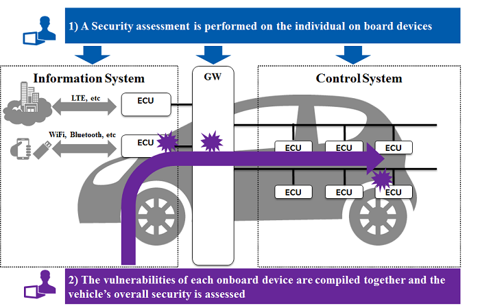The equipment installed in automobiles can be classified into three categories: "information systems," which connect to external networks or devices, "control systems" like the brakes and steering wheel, which control the motion of the vehicle, and "gateway (GW)" technologies, which separate these two systems. If an information system is attacked by something like an external network, the attacker may infiltrate the control system via the GW, which could allow them to manipulate the vehicle.