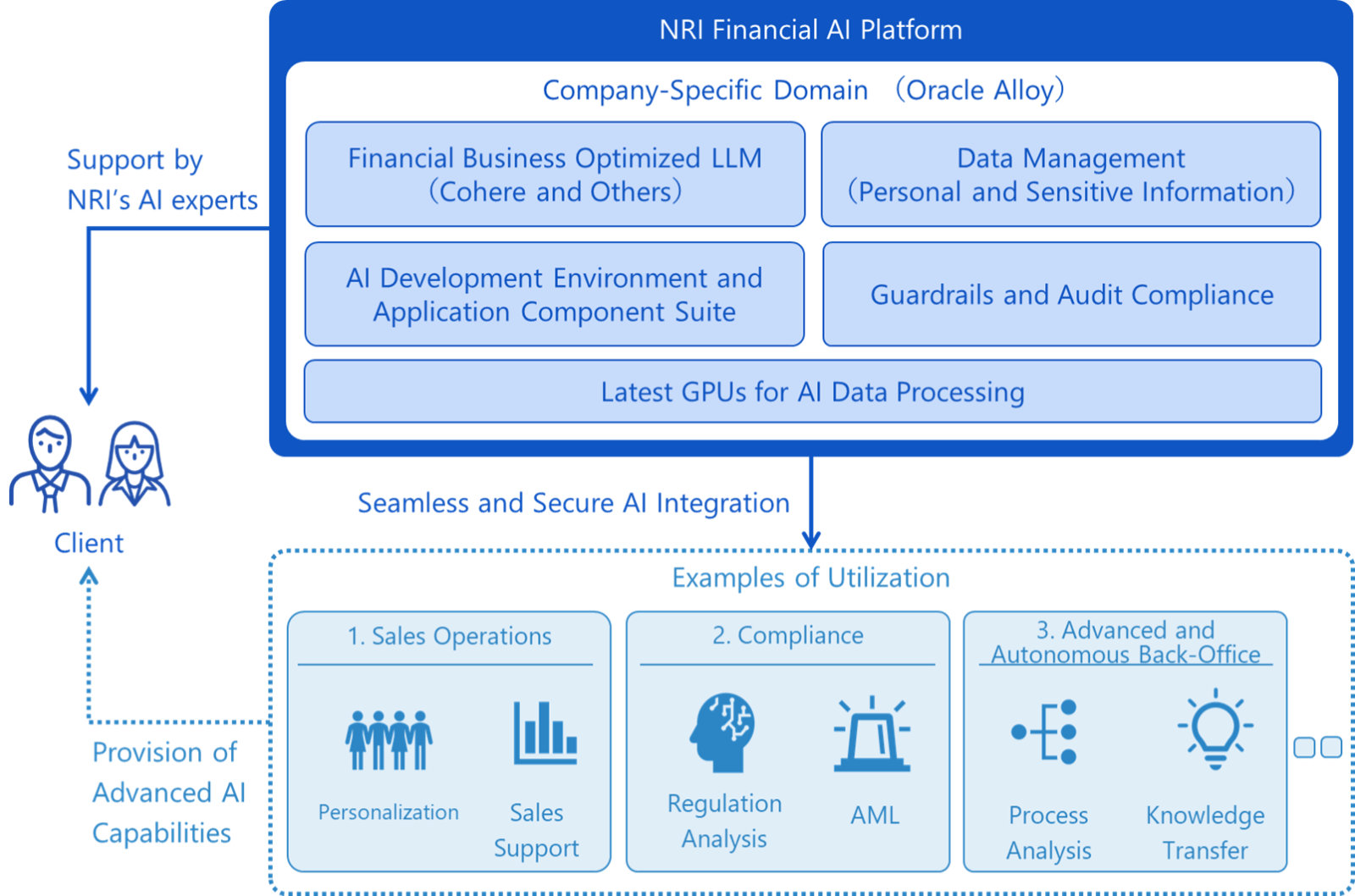 Tokyo, September 10, 2024 – Nomura Research Institute, Ltd. (Headquarters: Tokyo, Japan; President & CEO Kaga Yanagisawa, “NRI”) is set to launch the "NRI Financial AI Platform" (tentative name), a cutting-edge solution designed to meet the high data privacy and security standards of financial institutions while safeguarding data sovereignty1. The new platform will be rolled out in the first half of 2025, providing a secure and flexible space for clients to deploy AI in helping them unlock new revenue opportunities.
