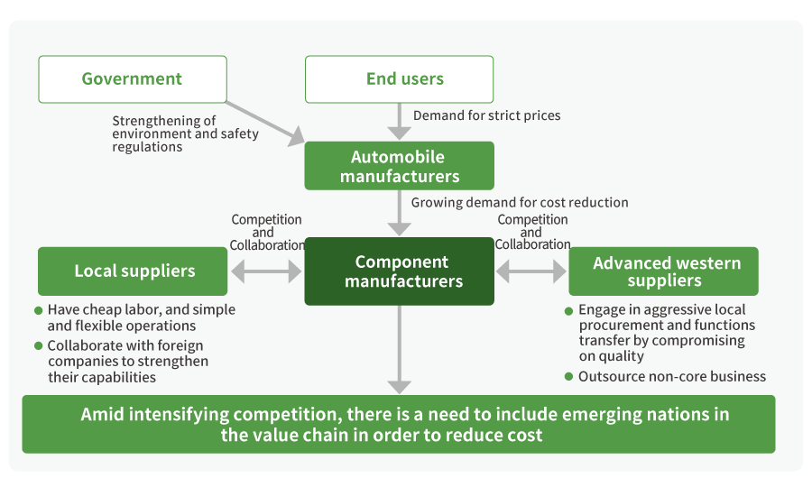 While the new car sales are hitting their peak in developed countries, importance of emerging nation markets including China is increasing. Under these circumstances, "cost reduction" is something that automobile and component manufacturers cannot overlook. With rise of middle class and strengthening of environment and safety regulations, emerging nations require "high-performance cars that can be purchased at affordable prices", and manufacturers are required to offer "low-cost products". With price demands from end users becoming strict, the demands of automobile manufacturers from component manufacturers for cost reduction is also getting severe. The operations centered on developed countries have reached a stage where any increase in fixed cost cannot be afforded. The component manufacturers must stay determined to reduce the cost by utilizing emerging economies.