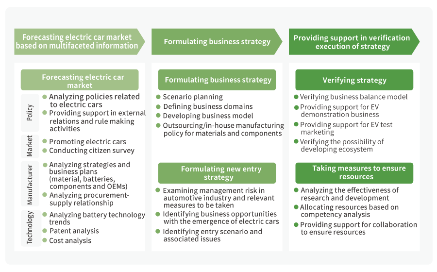 Using our industry knowledge, NRI can propose a strategy using client's strengths and provide execution support for the electric car, battery and materials business.