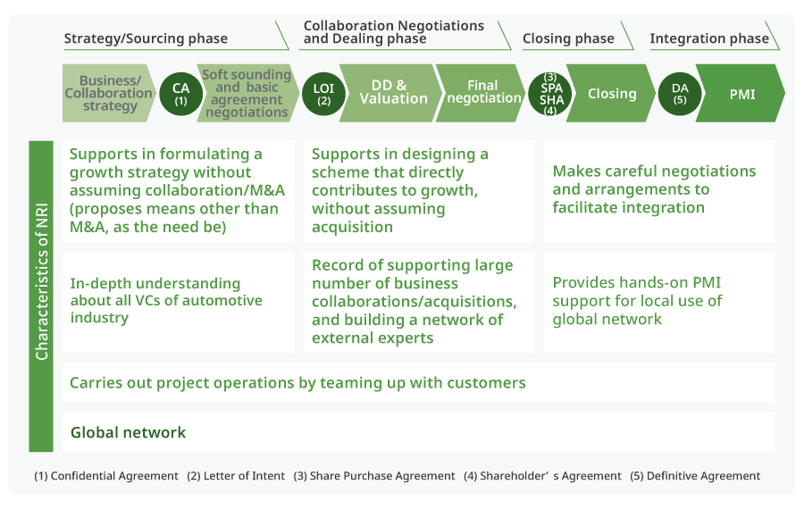 M&A and tie-ups also serves as an effective means to expand the functions for delivering value to the customer. Based on our in-depth knowledge about automotive industry, NRI provides support for collaborations and acquisitions from strategy building to PMI, for improving value addition.