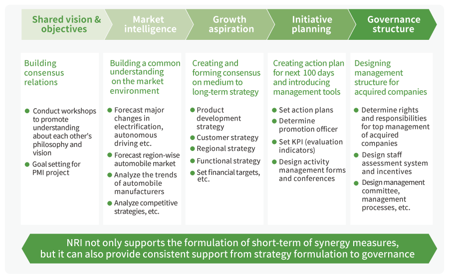 NRI analyzes that one of the factors for acquisitions failure is due to inadequate integration of strategic and governance aspects. Short-term measures such as cross-selling and joint procurement are not sufficient to achieve sustainable synergy. The long-term strategy of how to develop the system and how to sell it to the customers is strongly demanded. Also, in order to ensure the medium to long term strategy is promoted, it is important to design a governance system including management, evaluation, roles and responsibilities of the acquired company from own company.