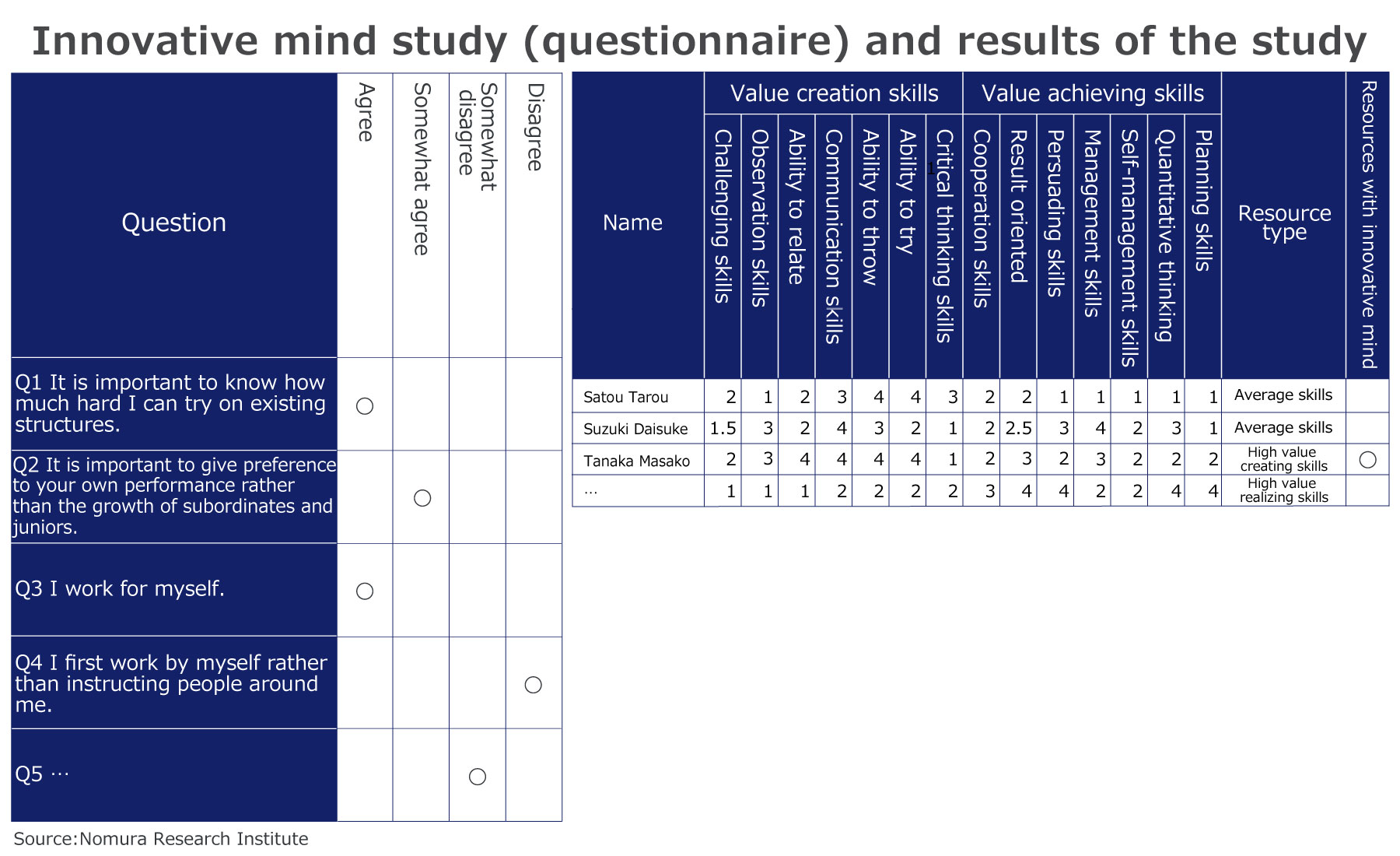 In order to promote the innovation, it is necessary to hire those resources who are inclined towards innovation. The skill set required for innovation includes “Value creation skills (creativity for innovation)” and “Value achieving skills (accountability for realizing innovation)”. Major companies have various resources with strong “value achieving skills” but only 5-10% resources with strong “value creation skills”. NRI has developed a mechanism called “Innovative mind study” which measures “Value creation skills” and “Value achieving skills” of an individual. The identification of “Value creation skills” and “Value achieving skills” of an individual through “Innovative mind study” is very important for appointing appropriate resources for the innovation.