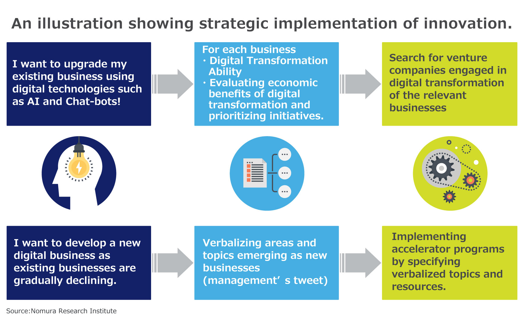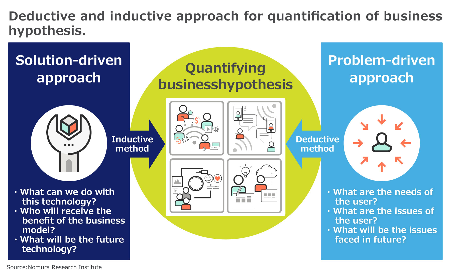 Many companies are facing challenges in the “creation of business hypothesis”, which has become a bottleneck in innovation promotion. The creation of business hypothesis is originally based on strong incentive (enthusiasm of doing something). However, such strong incentive cannot be seen in major companies. It may be seen either in those who are already running their businesses or who wish to leave major companies to start their business. The certain methodologies such as deductive and inductive approach are needed to quantify business hypothesis in the company. A deductive approach is a syllogistic method that includes confirming market needs, identifying latent markets and issues, and conceptualzing achievable business models. Meanwhile, inductive approach refers to collection of various ideas through “collaboration with venture companies that can provide ●● service with our company” and choosing an idea to draw a conclusion. This approach is used by Silicon Valley to develop new ideas one after another. Whereas, most of the major Japanese companies find it difficult to proceed further due to lack of “Certainty”. Therefore, it is important to combine inductive approach of Silicon Valley with the deductive approach. NRI supports the design and execution of the process through both deductive and inductive approach.