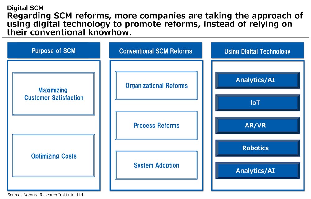 NRI’s approach to supply chain value creation and planning involves diagnosing the state of a company’s current supply chain, considering its products’ features with their desired growth markets, logistical features, and all other relevant details. NRI collaborates with clients in assembling a comprehensive reform plan encompassing all functions, from new product development to after-sales services.