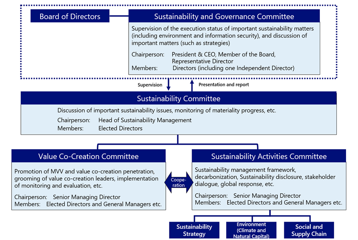 In addition, under the supervision of the Board of Directors, a Sustainability Committee, chaired by a director in charge of promoting sustainability management, has been established. The Sustainability Committee deliberates on important sustainability-related issues (including related risks and opportunities), among others. There are subcommittees under this Committee, each chaired by a senior managing director. They are the Social Value Creation Promotion Committee and the Sustainability Promotion Committee, which promote group-wide sustainability and regularly report their progress to the Board of Directors.