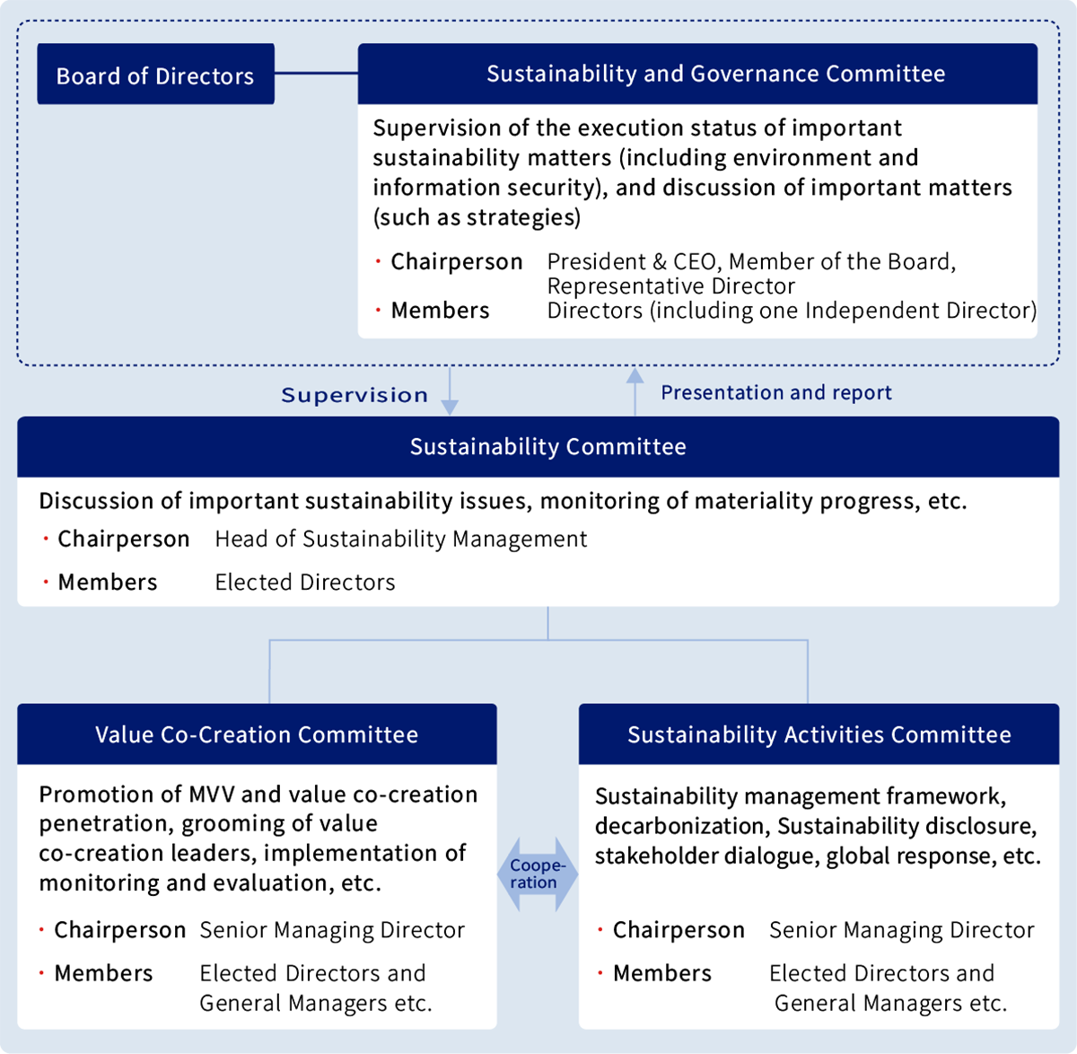 In addition, under the supervision of the Board of Directors, a Sustainability Committee, chaired by a director in charge of promoting sustainability management, has been established. The Sustainability Committee deliberates on important sustainability-related issues (including related risks and opportunities), among others. There are subcommittees under this Committee, each chaired by a senior managing director. They are the Social Value Creation Promotion Committee and the Sustainability Promotion Committee, which promote group-wide sustainability and regularly report their progress to the Board of Directors.