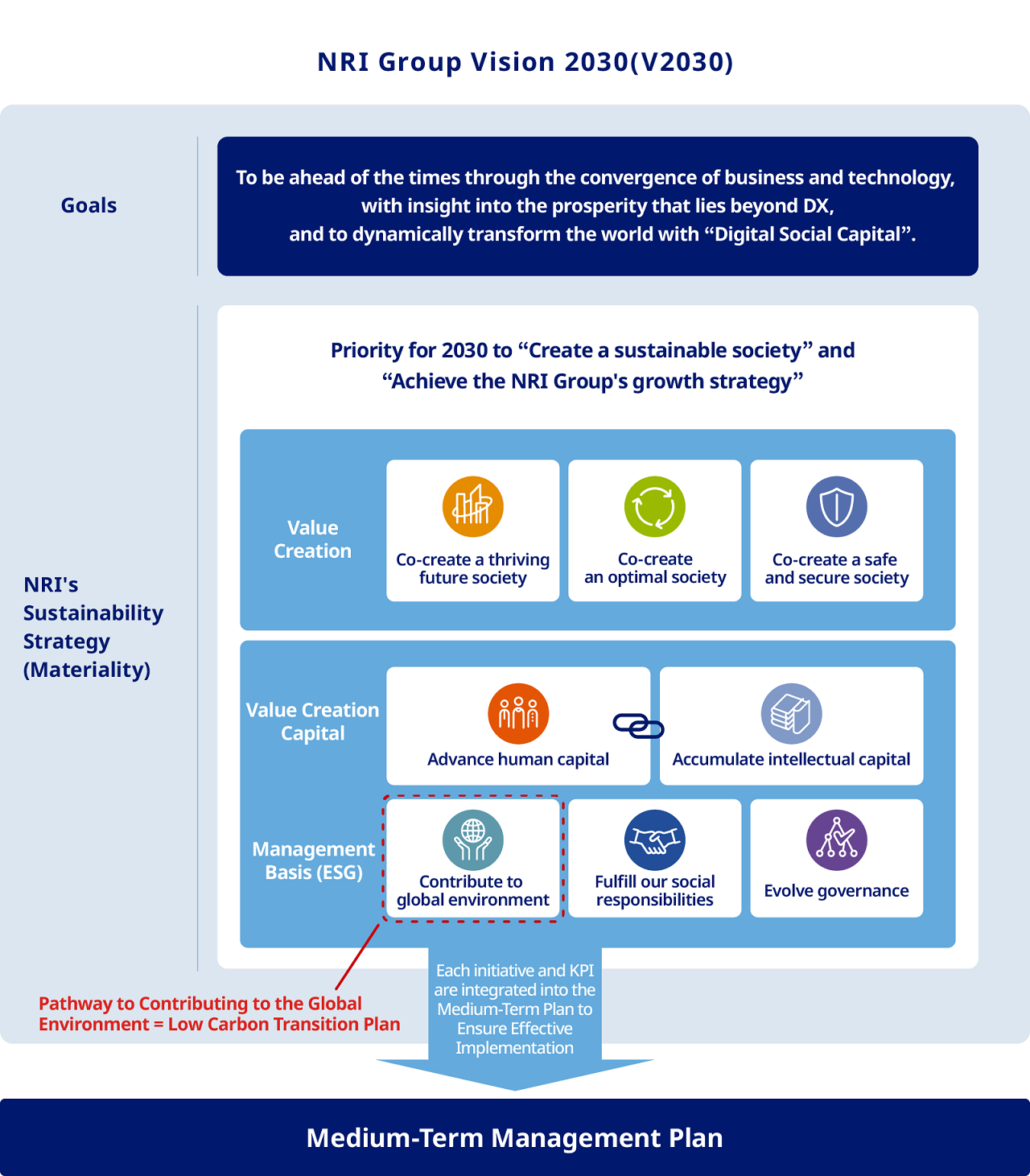 The NRI Group's long-term vision, "NRI Group Vision 2030 (V2030)", outlines priorities under its sustainability strategy (materiality), focusing on "Create a Sustainable Society" and "Achive NRI Group's Growth Strategy." As part of the theme "Contribute to Global Environment Through Collaboration with Business Partners," NRI has developed a "Low Carbon Transition Plan" to effectively manage its response to climate change, recognizing that protecting and restoring the environment is a collective global responsibility.