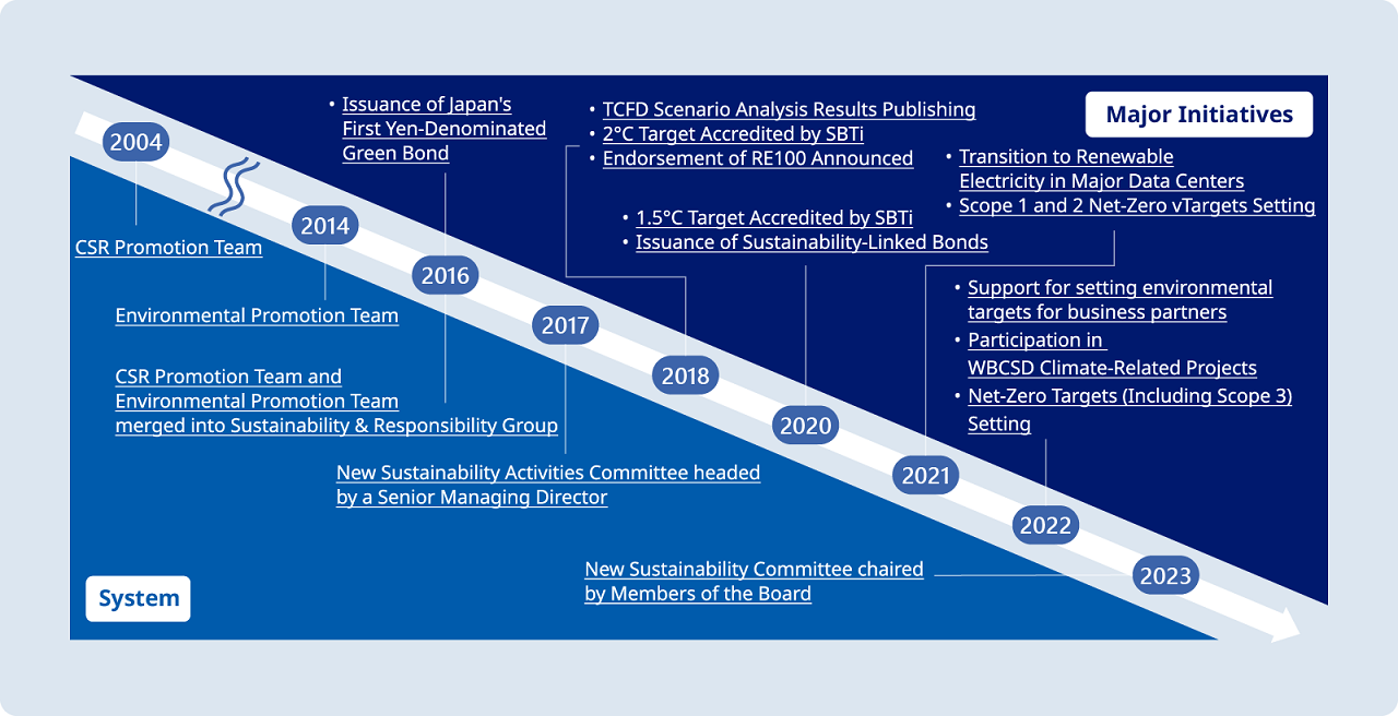 To address climate-related risks, the Sustainability Activities Committee, established under the direction of the President, works alongside the Integrated Risk Management Committee to promote sustainability management. Since FY 2018, the committee has been reviewing and deciding on measures to identify, assess, and address climate-related risks and opportunities, taking into account both the external environment and the progress of internal initiatives. Significant climate change-related considerations are also reported to the Sustainability Committee for further review and decision-making.