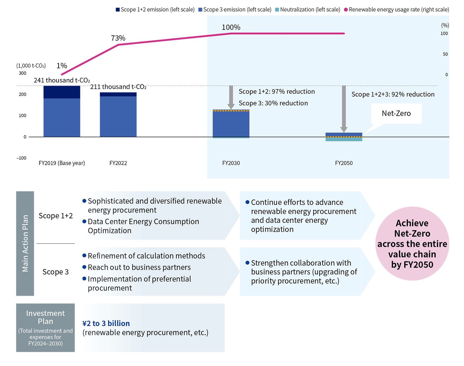The NRI Group's Low Carbon Transition Plan is being implemented with the approval and oversight of the Board of Directors to meet the environmental targets revised in FY2023. From FY2023 to FY2030, NRI plans to invest approximately 2 to 3 billion JPY in renewable energy procurement and other related activities.