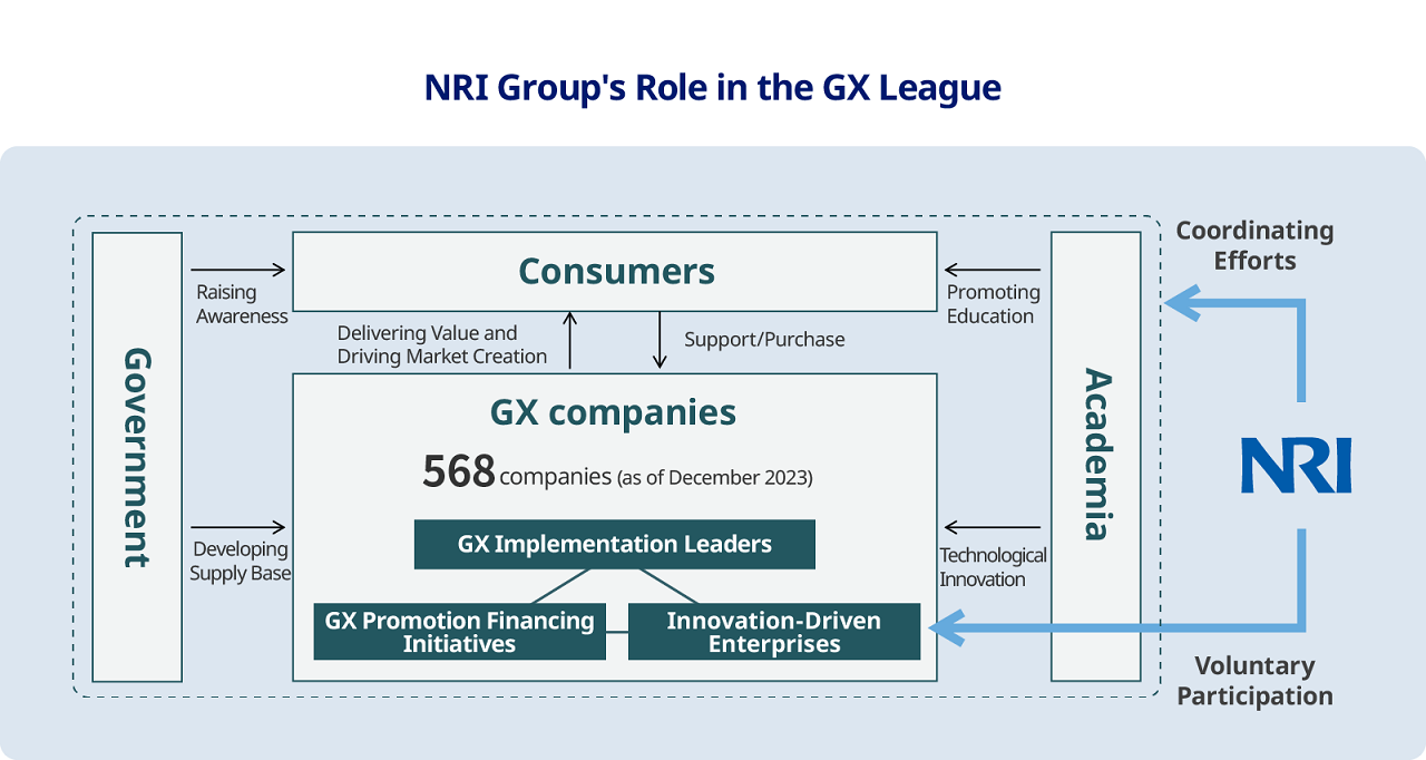 Since FY 2022, the NRI Group has served as the secretariat and overall coordinator of the GX League. In this capacity, we identify the diverse needs of Japanese companies in advancing GX initiatives and ensure these needs are reflected in policymaking.