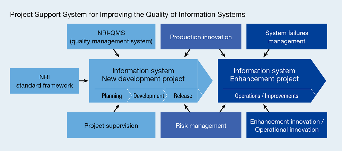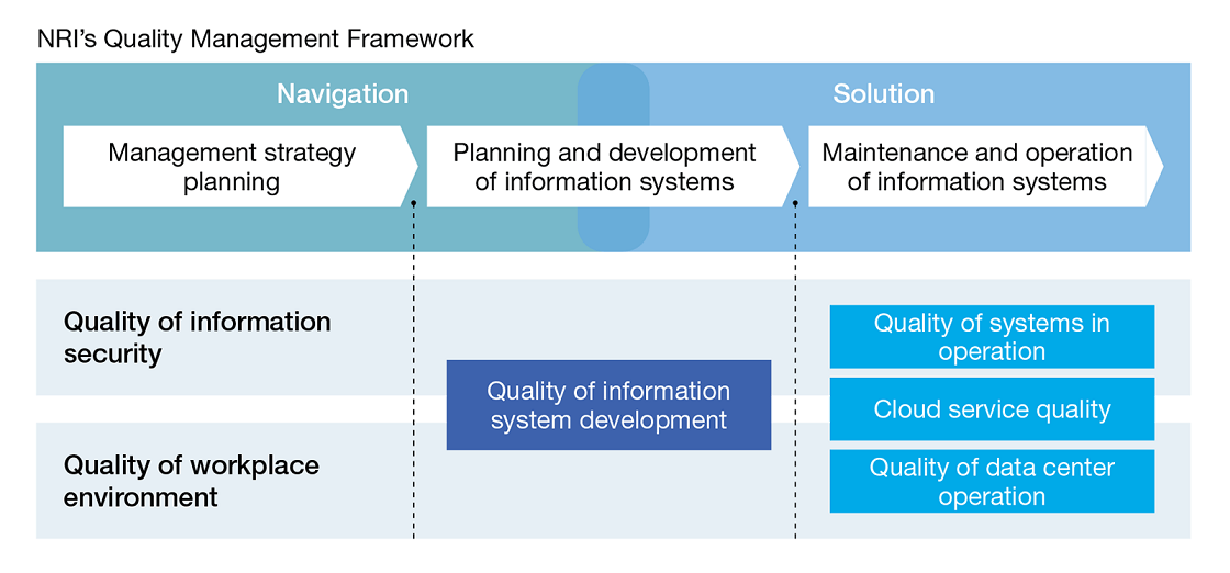 Each division is responsible for quality management of system development, maintenance and operations, and consulting services projects. In addition, NRI has an organization that proposes and supports quality management activities for each division.