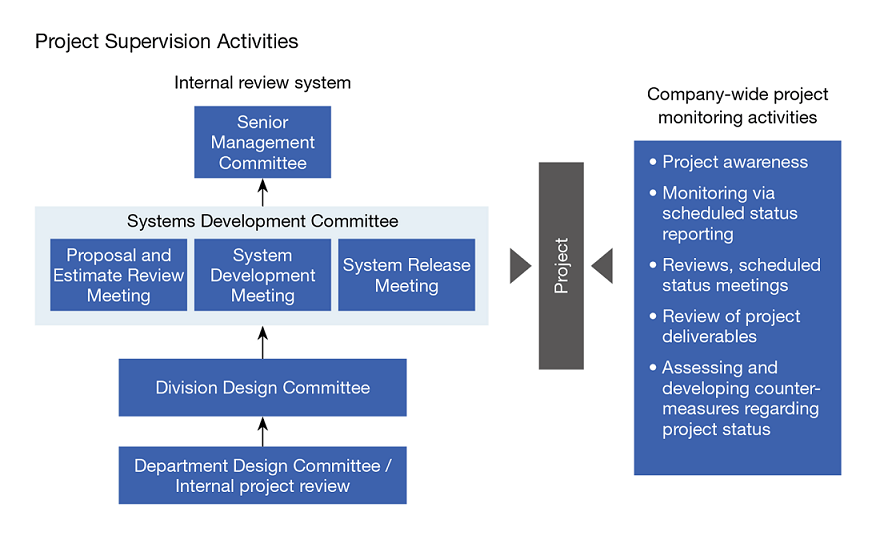 The Quality Management Division provides both supervisory and project management office functions for each individual division when they develop a new information system. In addition to project management for project implementation and success, NRI has a project supervision function to propose quality improvements, and to identify and resolve issues early on.