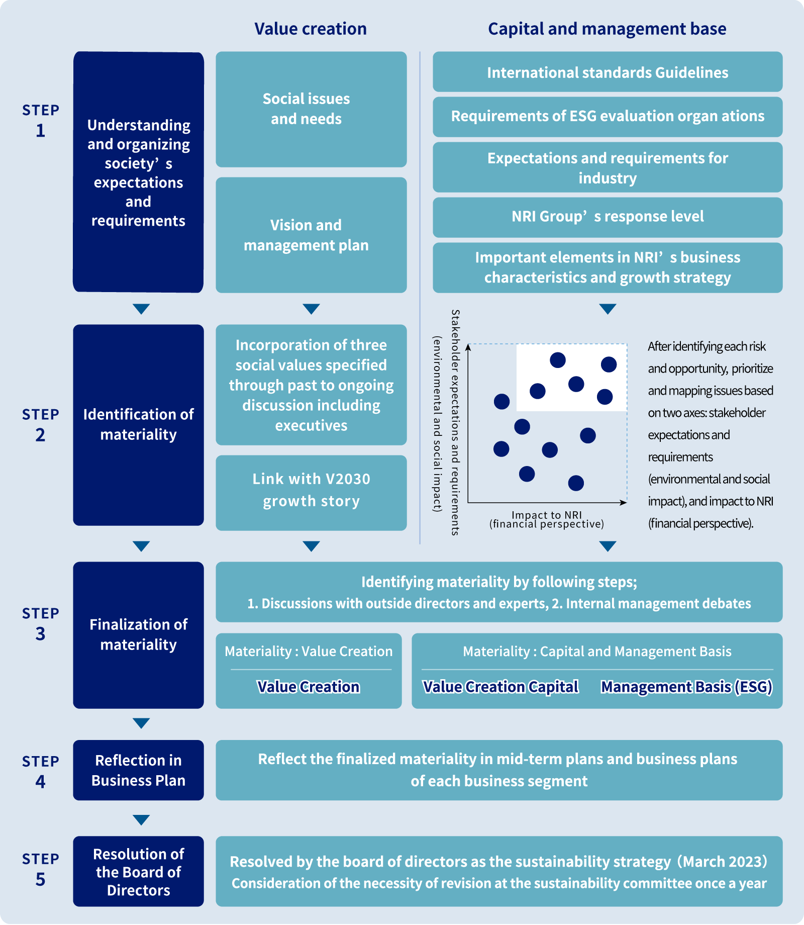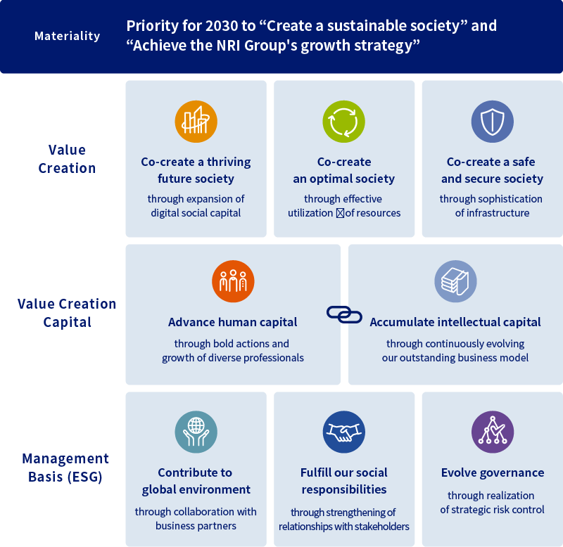 In formulating our long-term management vision "NRI Group Vision 2030" (V2030), we have reidentified our materiality based on expectations and requests from our stakeholders (impact on the environment and society) and concepts such as double-materiality, in addition to the financial impact on the NRI Group. In light of changes in the social environment and the NRI Group’s evolving business landscape, we identified key priority themes for 2030. For each theme, we assessed material issues by examining potential risks and opportunities over the short to long term.