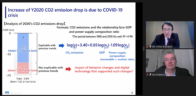 From left: Paul Dickinson of CDP (screen projection), Shingo Konomoto, Takeshi Hihara, and Eiko Ibuki of NRI