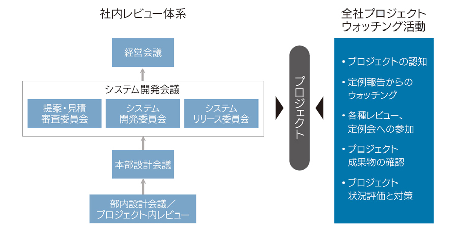 システム構築・運用、コンサルティングサービスのプロジェクト実施にあたっては、各事業本部が責任を持って品質管理を行うとともに、各事業本部の品質管理活動を推進・支援し統括する組織を置いています。