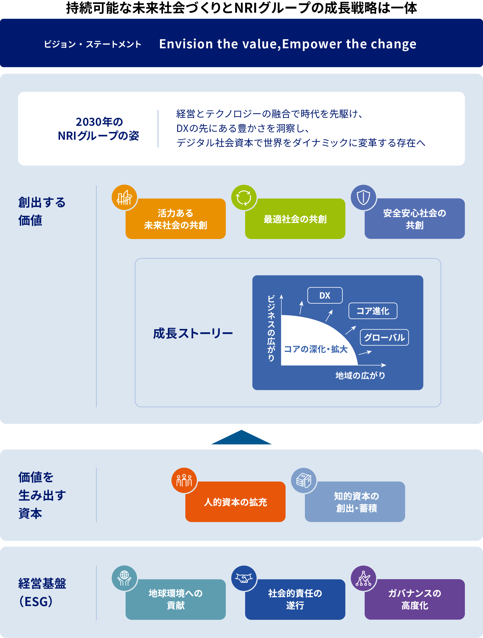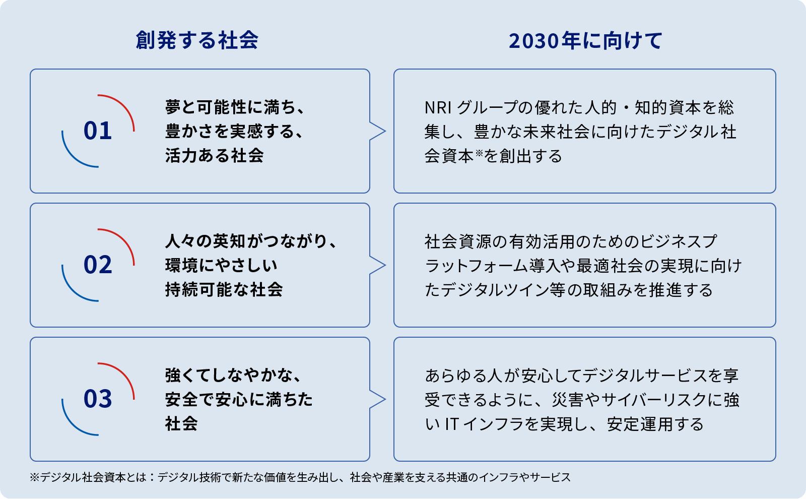 長期経営ビジョン「NRI Group Vision 2030」とは、私たちの企業理念である「未来創発」を実現するために描いた2030年度末までのストーリーです。経営とテクノロジーの融合で時代を先駆け、DXの先にある豊かさを洞察し、デジタル社会資本で世界をダイナミックに変換する存在を目指します。