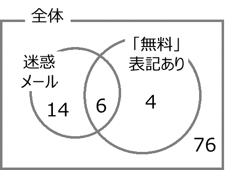 迷惑メールのうち本文中に「無料」表記がある割合は30%でしたが、同じデータでも見方を変えると、「無料」表記があるメールのうち迷惑メールである割合は60%となります。重なりの部分(6通)を、迷惑メール側から評価するか、「無料」表記あり側から評価するかの違いです。