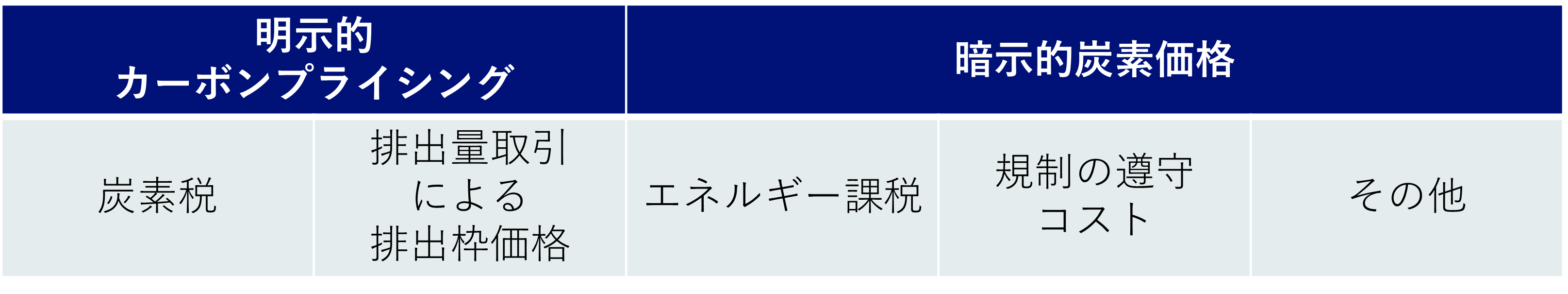 カーボンプライシングとは炭素排出に価格付けを行う仕組みです。温室効果ガス排出コストを内部化する事で、低炭素社会に向けた行動変容を促す目的で導入する手法の一つです。 カーボンプライシングは「明示的カーボンプライシング」と「暗示的炭素価格」の2種類に大別されます。前者の明示的カーボンプライシングは、排出される炭素に対して、1トン当たりの価格付けがなされるものを指します。一方で暗示的炭素価格は、排出量に対して直接価格を付けるのではなく、エネルギー消費量等に課税することで間接的に温室効果ガス排出量に価格を課す仕組みです。