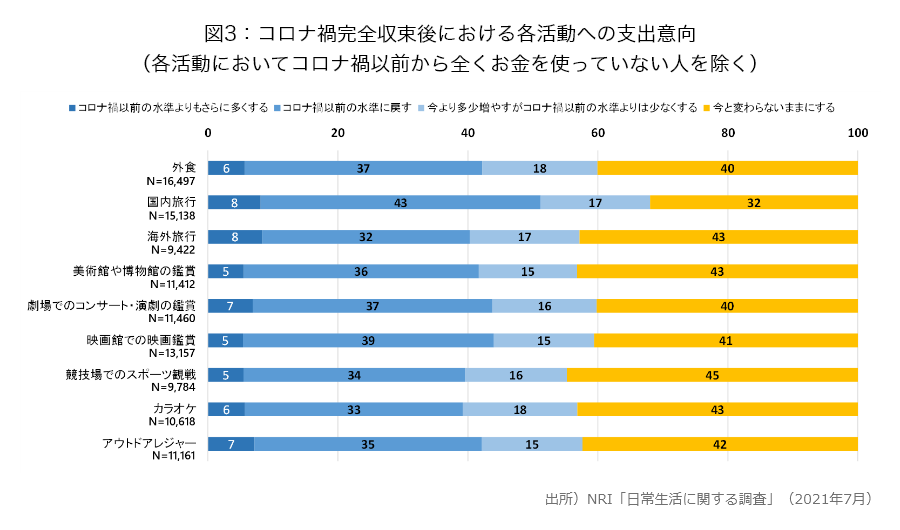 本調査では、コロナ禍が完全に収束した場合を想定し、外食や旅行など各活動への支出意向がコロナ禍以前の水準まで戻るかどうか、ワクチン接種と意向への関係性を分析した。まず活動の全体傾向を示したものが図3である。例えば国内旅行については、「コロナ禍以前の水準よりもさらに多くする」「コロナ禍以前の水準に戻す」の合計が半数程度になるものの、それ以外の活動ではそれらの合計割合が4割強の水準であり、現在の自粛(制限された)生活のまま変わらないと回答した人が多い。「コロナ禍以前の水準よりもさらに多くする」と回答したのは、どの活動でも1割未満であり、リベンジ消費による経済活性化は限定的とみてよさそうだ。