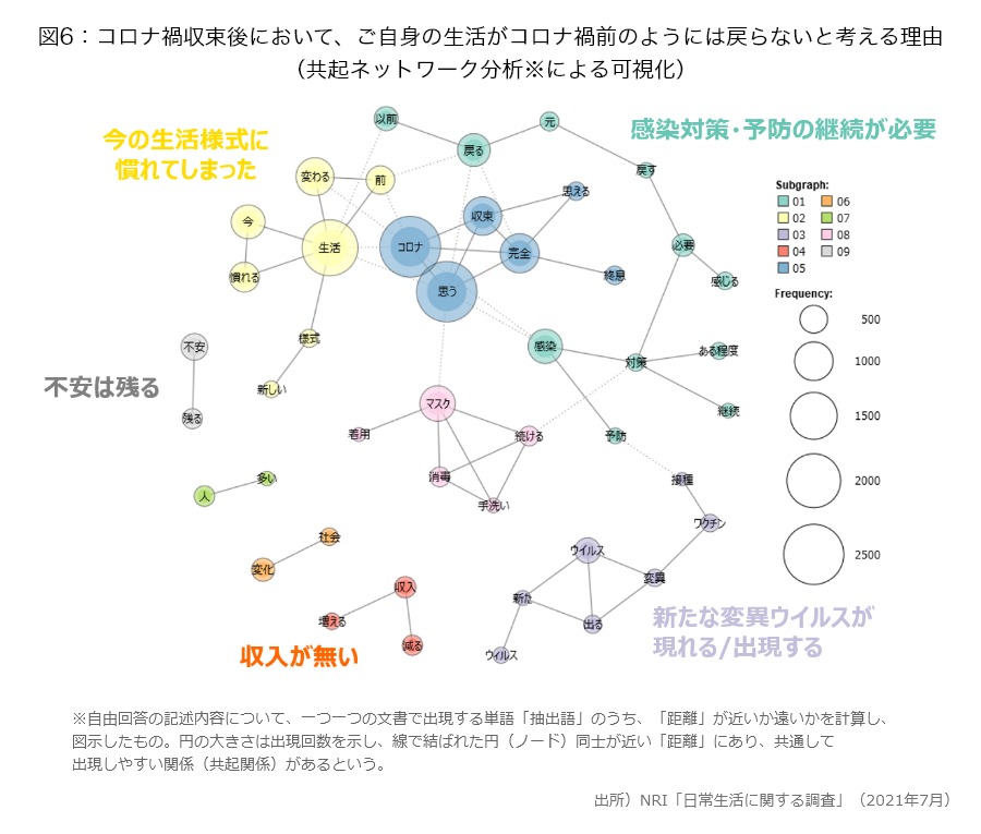 コロナ禍以前の生活に完全には戻らないと回答した75%の人に、その理由について自由回答形式で回答してもらった。その回答を、言葉の出現傾向として共起ネットワーク分析をしたものが図6である。コロナ禍が完全には収束するとは思えないと考える人が多く、またアフターコロナにおいても感染対策・予防の継続が必要だという意見や、新たな変異ウイルスが発生するなどの不安感を訴える声も挙げられた。一方、「今の生活様式に慣れてしまった」という意見も一定程度(後述するが、2割弱程度)存在している点が興味深い。