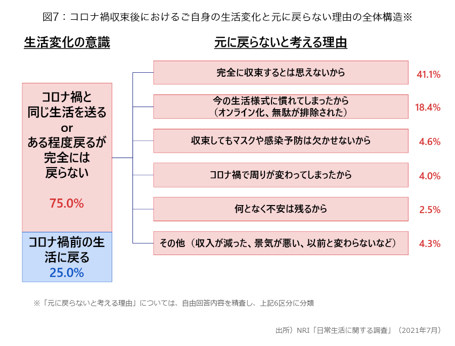 図5および図6の分析結果を構造化したものが図7である。コロナ禍以前の生活に戻らないと考える人は全体の75%存在し、その多くは現在(2021年7月時点)のコロナ感染爆発状況を見て、コロナ禍以前の生活に戻らない理由を、新型コロナウイルスが「完全に収束するとは思えないから」(41.1%)と考えている。