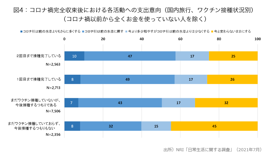 ただし、ワクチンの接種状況によって、支出意向に差異が見られた。図4は国内旅行について、ワクチン接種状況別に支出意向を分析したものであるが、ワクチン接種が進んでいる人ほど、コロナ禍以前の水準に支出を戻したいという割合が高くなっている(47%がコロナ禍以前の水準に戻したいと回答)。つまりこれから1回目、2回目のワクチンを接種する人は、それに従って支出意向も高くなっていくことが予想される。