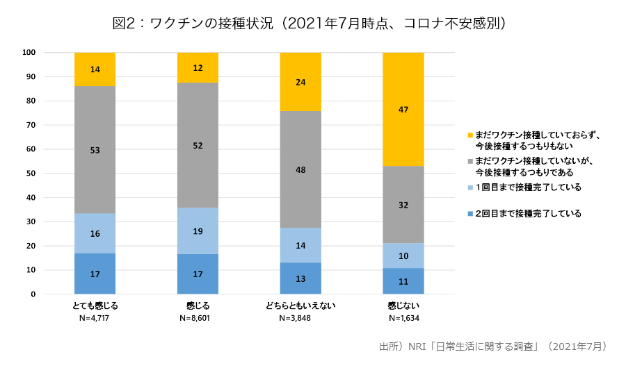 コロナへの不安感別に、ワクチン接種状況を分析したものが図2である。なお、不安を「とても感じる」人は全体の25%、「感じる」人は46%、「どちらでもない」人は20%、不安を「感じない」と答えた人は9%であった。