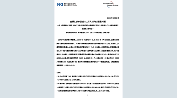 2040年に我が国の高齢者人口はピーク を迎えます。そして2025年4月1日から、企業には65歳まで雇用を確保する義務と、70歳まで就業機会を確保する努力義務が生じることから、60歳以上の雇用者数が急増し、企業の人件費負担が重くなります。そして60歳以上の雇用者は、産業構造の変化により、今まで通りの業務を続けることや希望する仕事を得ることが難しくなると予想されます。そこで企業には、60歳以上の雇用者に対する勤務日数の調整や働き方の柔軟化が、より一層求められることになります。この度、野村総合研究所(NRI)は、2025年1月、全国の50~59歳の男女計2,000人を対象に「50代正社員の60歳以降の就業意向に関するアンケート調査」を実施し(調査概要は末尾参照)、分析をしました。