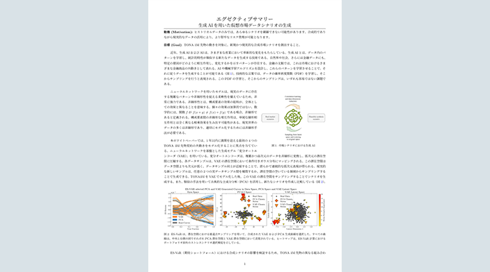 金融分野の数値データを用い、TONA 3か月先物の市場データ生成に生成AIモデル(変分オートエンコーダ:VAE)と主成分分析(PCA)を適用し、両手法で生成したシナリオを比較・分析した。その結果、VAEはPCAと比べてより多様なシナリオを生成でき、期待ショートフォールおよびバリュー・アット・リスク(ES-VaR)の算定にも影響を与えることが明らかとなった。