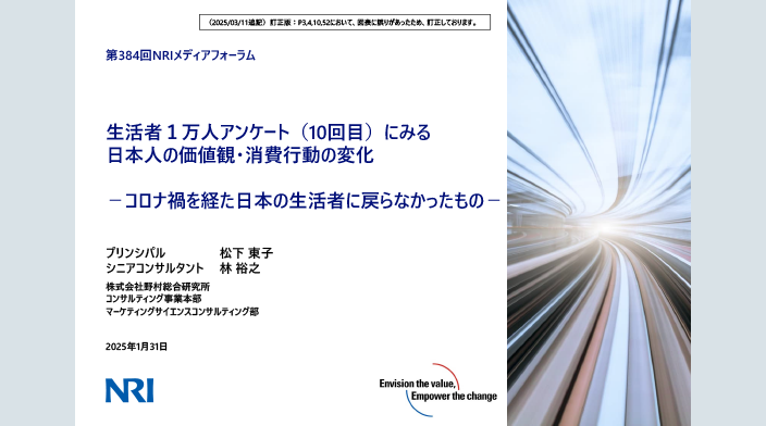 NRIは、2024年の8月、全国で15歳~79歳の男女個人1万人を対象に、訪問留置法で生活価値観や消費実態を尋ねる「生活者1万人アンケート」を実施しました。1997年以降3年おきにこのアンケートを実施しており、今回が10回目となります。コロナ禍で大きく変化した人々の生活は戻りつつあります。しかし、デジタル化がシニアを中心に加速したことで余暇の楽しみ方やチャネル利用、人づきあいの仕方が戻っていない、また、テレワークなど柔軟性の高い働き方を経験したことにより就業価値観が変わったなど、日本人の価値観・消費意識は、すべてがコロナ禍以前のように戻ったわけではないことがうかがえます。今回、1.生活価値観、2.働き方・就業価値観、3.余暇・チャネル利用、4.消費価値観・消費スタイル、5.情報利用行動の5つの分野について、2024年に見られた時系列変化のポイントを速報としてご紹介します。