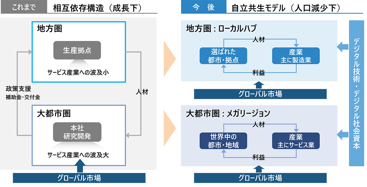 これまでの日本は、東京を中心とする大都市圏が頂点となり、地方圏と相互に依存しあいながら国全体の経済を発展させてきた(左図)。地方圏は大都市圏に人やエネルギーを供給し、大都市圏は地方圏に資金を提供してきた。しかし、人口が急減し、気候変動への対応という地球規模の課題も迫られる今、その中央集権的なモデルは限界を迎えている。もはや、大都市圏の成長の余力はないのだ。