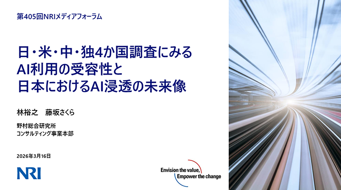 NRIは、2025年の9月、日本・アメリカ・中国・ドイツで15歳~69歳の男女個人3000人を対象に、生成AIの利用状況や利用用途、生成AIに対する考え方等を尋ねる「AI利用に関する国際比較調査」を実施しました。