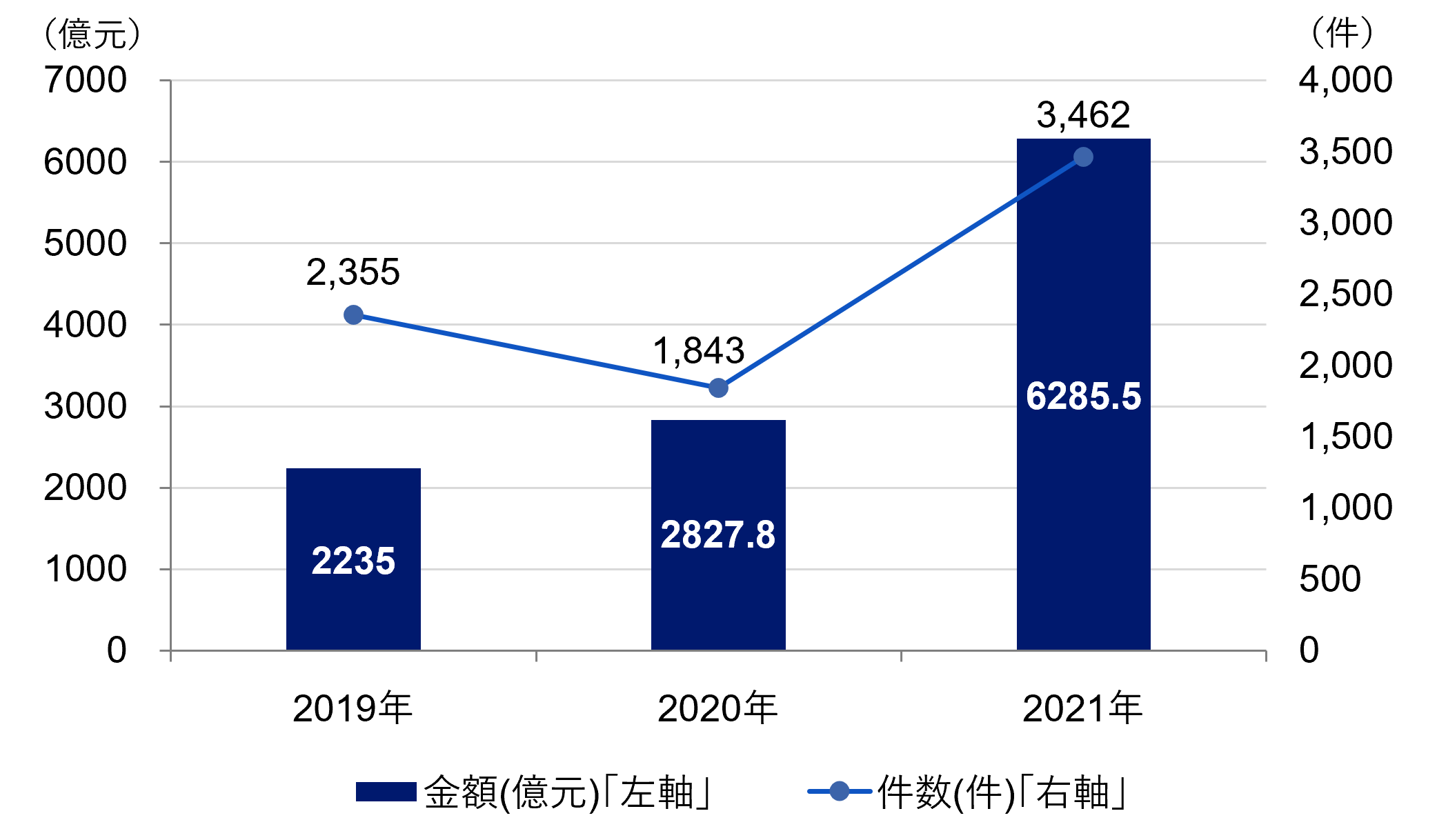 図1:中国デジタル産業の投資規模の推移(2019年~2021年)