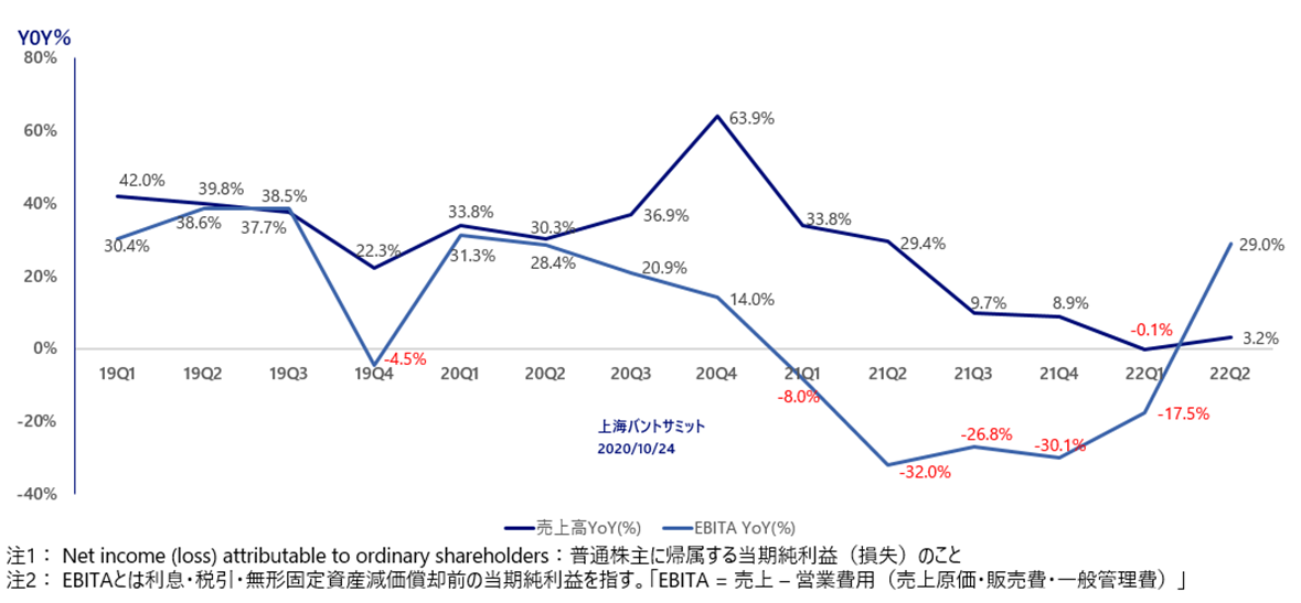 図1:アリババの売上と当期純利益(EBITA)の前年同期比の推移