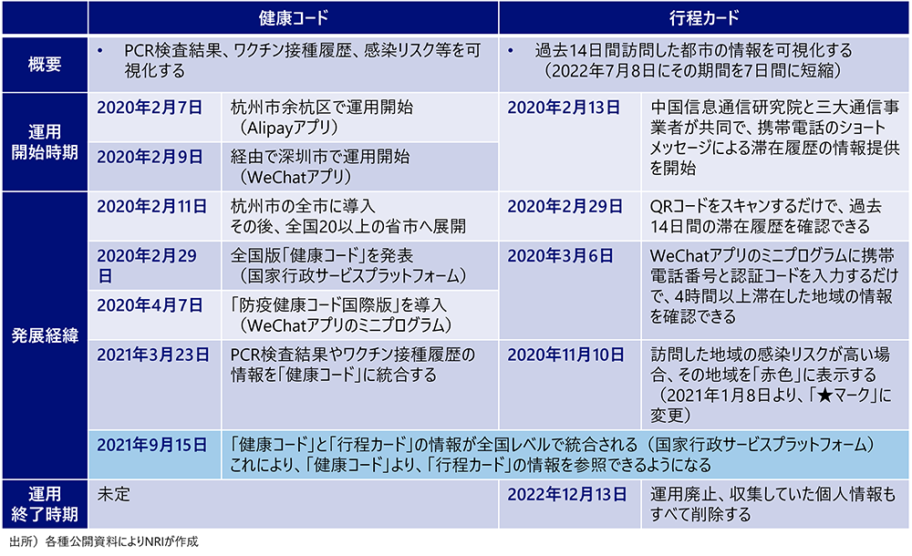 中国の「デジタル・社会ガバナンス」の実現にあたっては、その裏側で、クラウド・コンピューティング技術、ビッグデータ分析技術等が活用され、分野間のデータ連携が実現している「デジタル基盤の整備」が大きく寄与している。「健康コード」と「行程カード」は、いずれも武漢での感染拡大を受け、短期間で開発され、その後、継続的に機能改善が行われた。筆者の実体験から言えるのは、これらのコード(カード)を利用したサービスは、すべてスマホアプリで簡易に申し込むことができ、高齢者を含めてほぼすべての国民に浸透している。また、ワクチン接種情報、PCR検査情報など異なる分野の情報が、システム上でデータ連携でき、国民が自ら情報を探したり入力したりしなくて済む。その上、毎日多くの国民から頻繁にアクセスされる にもかかわらず、ほぼ遅延することなく利活用できた点は、中国のデジタル基盤がしっかり構築できていたことの証左といえる(表)。