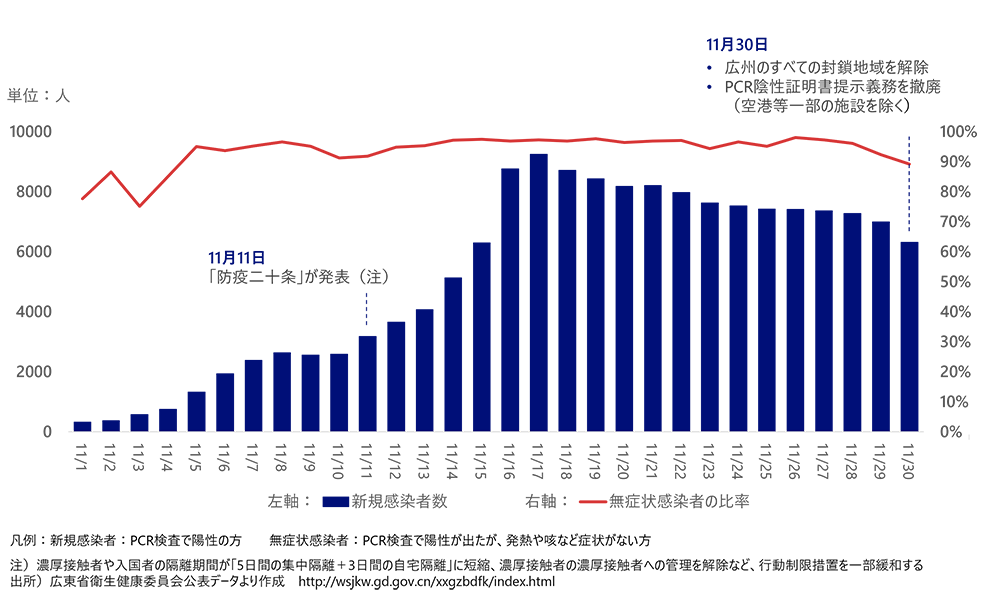 2022年11月頃、一時期1日あたり9000人を超える感染者数を記録している広州では、約1ヶ月間ほぼ全市における店内飲食の禁止と厳しい外出制限を実施しても感染者数が高止まっていた。しかも、居住者全数を対象とするPCR検査で見つけた感染者のうち、9割が治療不要な無症状感染者(PCR検査では陽性と出るが、発熱や咳などの症状がない人)である(図)。