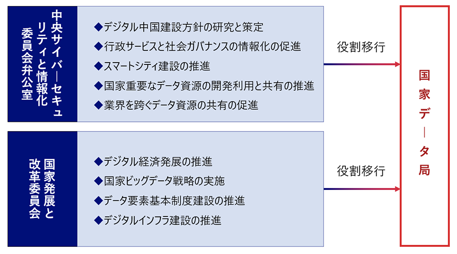 中国は2022年12月に「データ要素をより活用するためのデータ基本制度の構築に関する意見」(通称「データ二十条」)を発表した。データの「価値化、資源化、資産化、資本化」という戦略を打ち出し、国主導でデータの権益確定、流通、取引、価値化を推進しようとしている。国家データ局は、この戦略の実行役として、データ取引の制度設計や、データインフラの構築に対する国の支援を充実させ、データ産業の発展を促進することを担うとともに、集約される権限を活用してデータのサイロ化を打破し、データ統合を実現させることである。