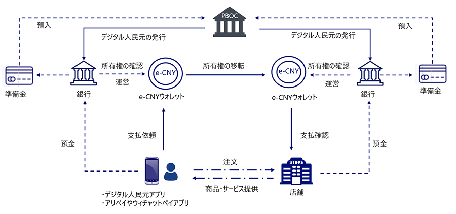 、加盟店、利用者と繋がり、加盟店にデジタル人民元ウォレットの開設支援、QRコード決済、アプリ決済などさまざまなインターフェースを提供する役割を担う。また、中央銀行と連携して、キャンペーンを企画する等デジタル人民元の導入の推進役としても期待されている。一般的に政府主導で推進するサービスは、ユーザー・エクスペリエンスの設計、消費者と接点のある各種店舗や事業者との協業関係の構築が民間企業と比べて得意ではない。このような観点から、デジタル人民元の運営機関と二大決済プラットフォーマーは対立するものではなく、むしろ、協力関係となっている。