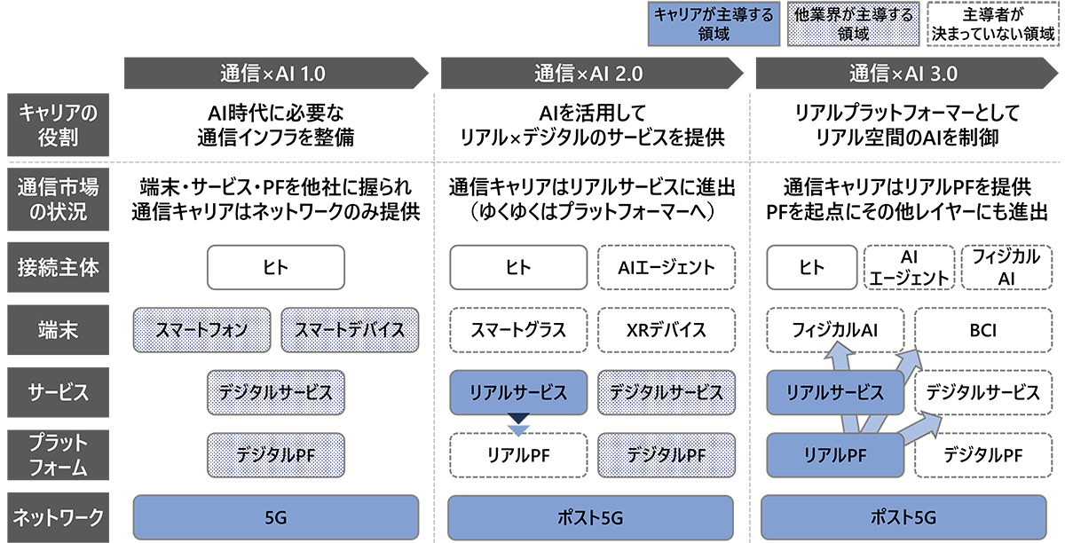 2026年現在(AI 1.0)の通信キャリアは、端末・サービス・プラットフォームをGAFAMなどの他業界に握られ、ネットワークのみを提供する存在となっている。2030年代(AI 2.0)には、サービスレイヤーにも染み出すことで、競合との差別化を図ると同時に、マネタイズできるレイヤーをネットワーク以外にも広げていくことが期待されるであろう。なお、2040年代以降(AI 3.0)には、2030年代に広がるリアルサービスを起点として、プラットフォームや端末など、現状の通信キャリアが獲得できていないレイヤーへの進出が期待されている(図3)。