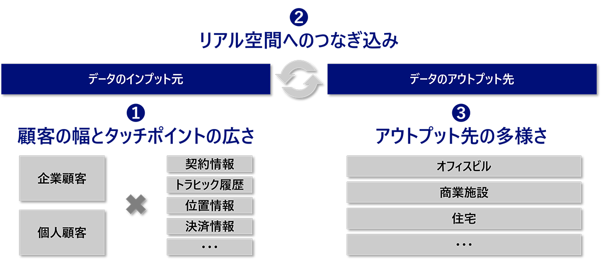 第一に、通信キャリアは、業種を横断したさまざまな企業の顧客基盤と、個人顧客の両面で接点があり、契約情報以外にもトラヒック履歴や決済情報などの複数のデジタル情報と、位置情報や店舗情報といったリアル情報の双方を取得していることが特徴である。顧客の幅とタッチポイントの広さ(①)という観点では、ビッグテック以外に通信キャリアに比類するものはいないと想定される。