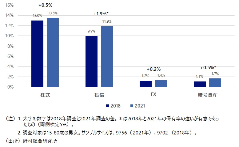 まず、暗号資産の普及度を消費者の保有率の動向で確認したい。図表1は、2018年と2021年調査における回答者(15~80歳の男女)の4つのリスク資産(株式、投信、FX、暗号資産)の保有率を示したものである。