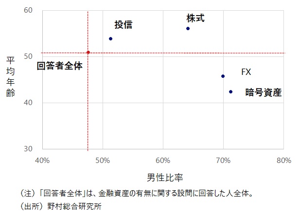 2021年調査では、暗号資産を保有していると回答した人の男性比率、平均年齢はそれぞれ71%、42歳だった。回答者全体と比べて男性比率は高く平均年齢は低い(図表2)。FXと同じように、若年層、男性に人気の高い商品と言える。伝統的なリスク資産である投信や株式の保有者と比較すると、平均年齢は低いが、回答者全体より男性比率が高い点で共通する。ただし投信保有者と比べるとさらに保有者が男性に偏っている。