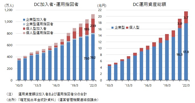 DCには勤め先がプランを設定し、主として勤め先が掛金を拠出する企業型と、個人が自ら金融機関を選択し、主として個人自身が掛金を拠出する個人型(愛称:iDeCo)がある。勤め先もしくは自身で掛金を拠出している人を加入者と呼ぶが、加入者数は制度が創設された2001年以降毎年、増加が続いている(注1)(図表1左参照)。特に、2017年にiDeCoへの加入が勤め先に企業年金のある人や専業主婦・主夫も可能になると、iDeCoの加入者が増加し、DC制度全体の加入者数の水準を押し上げている(注2)。22年3月期1年間の加入者の純増数は企業型、iDeCoそれぞれ32万人、45万人となり、制度創設20年を経て加入者数は企業型とiDeCoの合計で初めて1,000万人を超えた。なお、加入者に加え運用指図者(以前に勤め先もしくは自身で掛金を拠出し、現在は拠出せず運用だけ行っている人)を含めた制度利用者数は、21年3月期に既に1,000万人を超え、直近(22年3月時点)では1,129万人に達している。