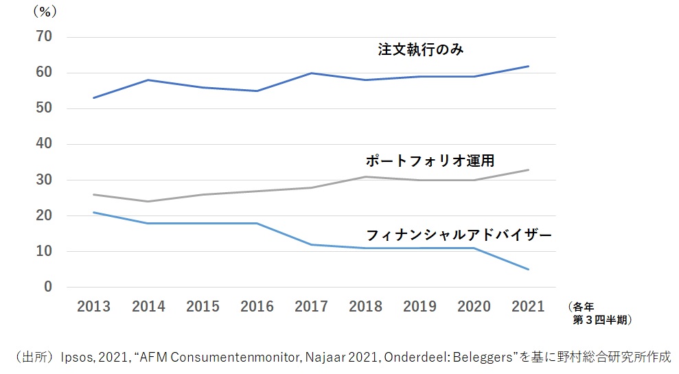 一方、誘因報酬の禁止への反対派が最も懸念するのが、投資金額の小さな消費者のアドバイスへのアクセスが制限される「アドバイスギャップ」である。Ferber氏は、投資額の小さな多くの投資家にとって、独立アドバイスに数百ユーロ以上の手数料を最初に支払うのは合理的でない、と指摘。そうした投資家が投資アドバイスにアクセスできるのは誘因報酬で賄われる非独立アドバイスだけで、誘因報酬を禁止すると専門的な投資アドバイスを受けられなくなってしまうと主張した。下図はオランダの個人投資家の主たる投資方法の推移である。2013年に投資ファンドなどの販売に誘因報酬が禁止されて以降、ファイナンシャルアドバイザーを通じた投資の割合が低下する一方、注文執行のみ、ポートフォリオ運用(投資一任)の割合が上昇している。