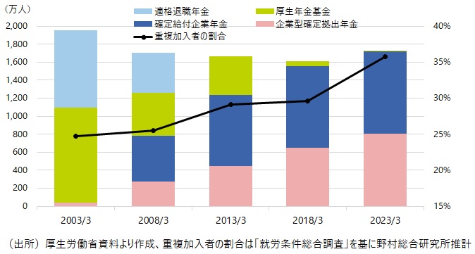 2つの割合の違いは複数の制度に重複加入する者の取り扱いの違いで、資産運用立国実現プランで指摘した「3割」は、重複加入分を控除した実加入者数を分子にしているようだ。社会保障審議会企業年金・個人年金部会の過去の資料 等を基に民間企業社員 の私的年金への加入状況を整理してみるとDB型年金と企業型DCの両方に加入している人は424万人いることがわかる。また勤め先に企業年金のあるiDeCo加入者も28万人いることがわかる。この2つの重複加入のケースだけ考えても、実加入者は1,422万人、加入率は35%となり、資産運用立国実現プランに示された割合に近い。
