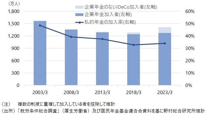 政府は資産運用立国実現プランで、企業年金やiDeCoを含む私的年金の加入率は、重複加入分を除くと3割に過ぎないことを明らかにした。この加入率を遡って推計すると、かつては5割近かったが2000年以降徐々に低下していることがわかった。加入率の低下の要因が、中小企業において企業年金の清算 が多かったことや、企業年金の加入対象から外れた60歳以上の被用者が増加したことなどである点を踏まえると、私的年金の普及促進にはiDeCo+ (イデコプラス)や職場iDeCoの普及や60歳以降の被用者のiDeCoの加入促進策などが重要といえる。