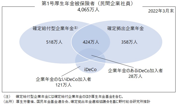 (注2) 2022年3月時点のDB型年金の加入者数は942万人(確定給付企業年金930万人、厚生年金基金12万人)、企業型DCの加入者は782万人、iDeCo加入者のうち民間企業会社員は150万人である。