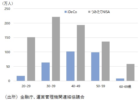 このような改革を経ても、iDeCoは若年層の利用が少ないと言われている。実際2018年からスタートした「つみたてNISA」と比較すると(図表2)、「つみたてNISA」の利用は30代が最多なのに対して、iDeCoは40代が最多である。また、NISAは20代でも多くの人が利用しているのに対して、iDeCoの場合が20代で利用している人は少数だ。この理由として、60歳まで引き出しができないことが、多額の出費を伴うライフイベントを多く控える若年層には加入への高いハードルになっていると指摘されている。