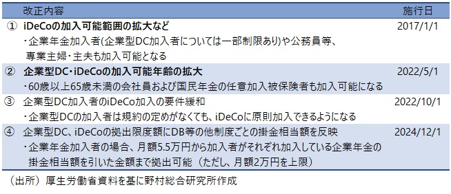iDeCoは企業型DC(企業型確定拠出年金)と共に2001年に導入された制度で、当初は自営業者等と企業年金に加入していない民間企業社員のみが加入(掛金を納付)できる制度であったが、2017年以降、多くの人々の老後に向けた自助努力に活用できる制度へ方向転換が図られている(図表1参照)。